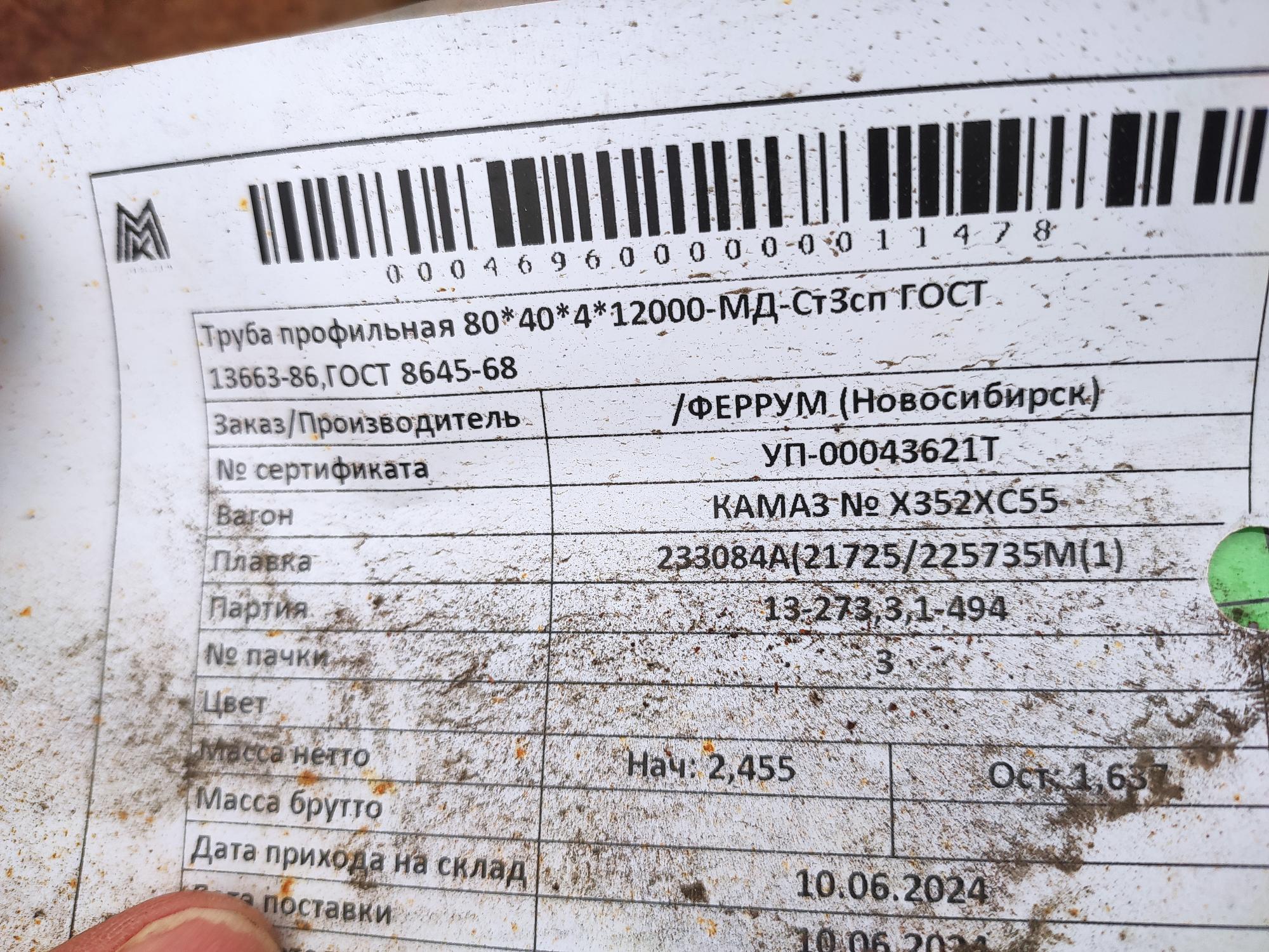 Труба профильная ГОСТ 13663-86,ГОСТ 380-2005,ГОСТ 8645-68 (80-40-4) 80*40*4*12000-МД-Ст3сп ГОСТ 13663-86,ГОСТ 8645-68 (Феррум)